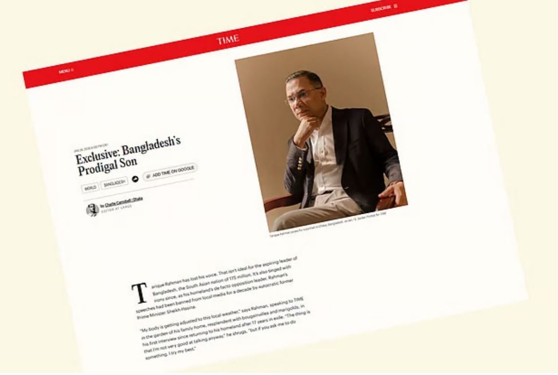 টাইম–এর প্রতিবেদনে বলা হয়, আশা করা হচ্ছে, নোবেলজয়ী অধ্যাপক মুহাম্মদ ইউনূসের নেতৃত্বাধীন বাংলাদেশের অন্তর্বর্তী সরকারের শুরু করা প্রাতিষ্ঠানিক সংস্কারগুলো এমন এক প্রয়োজনীয় ভারসাম্য তৈরি করবে, যা দেশকে আবার স্বৈরতন্ত্রের দিকে ধাবিত হওয়া থেকে রক্ষা করবে। আর এ জন্য দীর্ঘ রাজনৈতিক নির্বাসনের সময়ে তারেক রহমান প্রয়োজনীয় আত্মোপলব্ধি ও পরিপক্বতা অর্জন করেছেন, যাতে তিনি দেশের জনগণের প্রকৃত নেতা হয়ে উঠতে পারেন।